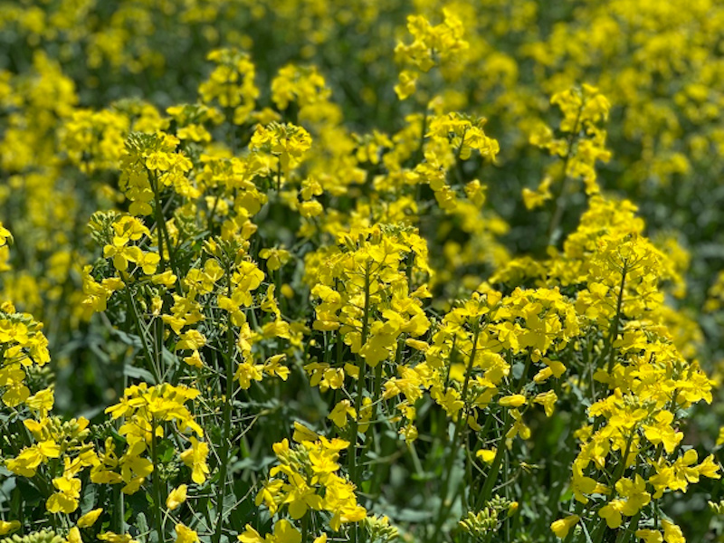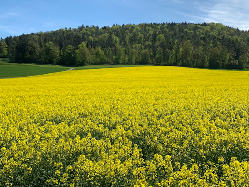 Der heimische Raps verschönert unsere Landschaft im Mai mit seinen intensiv gelben Blüten. Die Öl Ausbeute ist hoch: für einen Liter Öl werden ca. 2.3 Kilogram Samen benötigt und es ist sehr gesund! Es gilt gar als gesündestes Speiseöl dank seinem perfekten Verhältnis von ungesättigten und mehrfach ungesättigten Fettsäuren von 2:1. Der Gehalt an essenziellen Fettsäuren ist beim Rapsöl um ein Mehrfaches höher als beispielsweise bei Olivenöl.